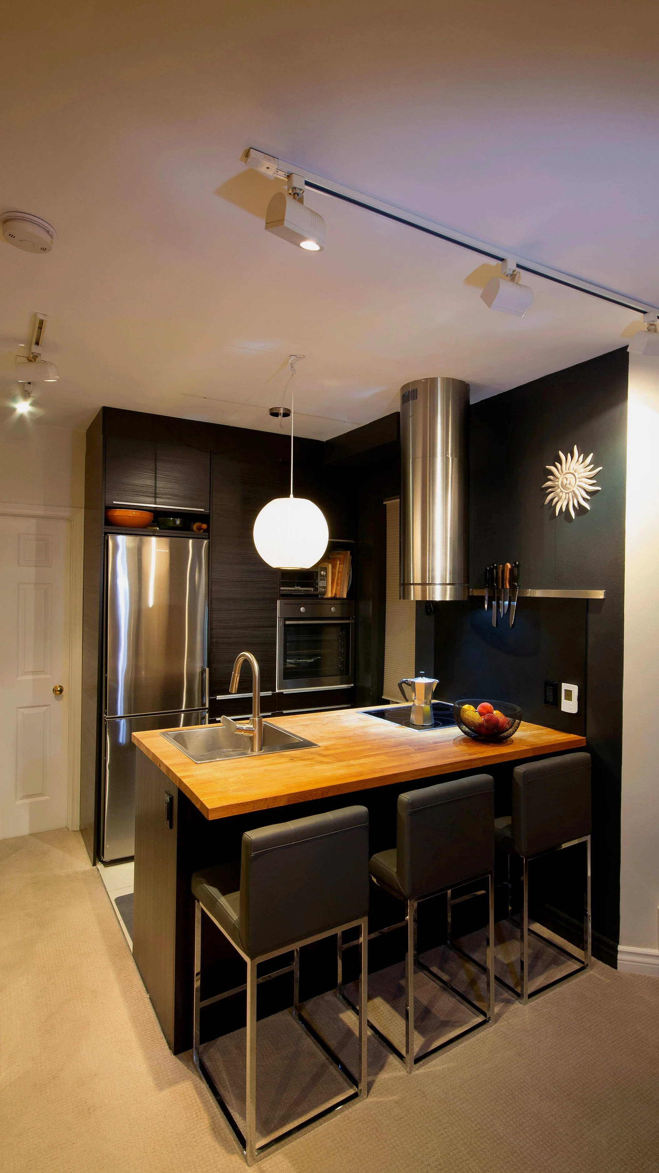 In the bedroom, a bold, oversized leather headboard anchors the room, softened by crisp white linens and a minimalist nightstand. Every detail in Charlie’s Condo speaks to a love of clean lines, rich textures, and urban sophistication.