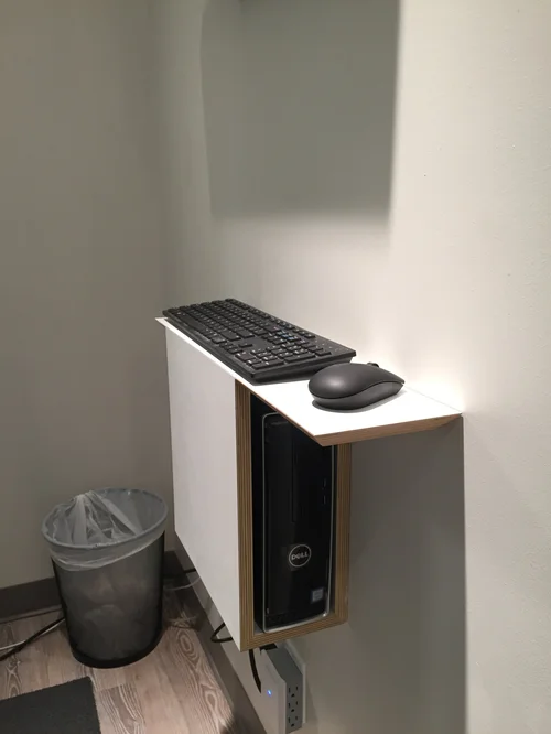 This modern chiropractic clinic renovation strikes a perfect balance between professionalism and approachability. A calming palette of warm white and taupe anchored by a sophisticated blue-grey and walnut wood tones sets a serene foundation. Playful, colourful coat hooks and clever shoe storage add a touch of personality and charm to the entry zone. The waiting area features light woodgrain flooring, streamlined ergonomic seating, and soft lighting, creating a bright, welcoming environment for patients of all ages. Space is optimized in the adjustment areas with custom-designed computer stations, beveled exposed plywood edges with a white laminate finish, creating a clean, floating aesthetic and freeing up floor space.