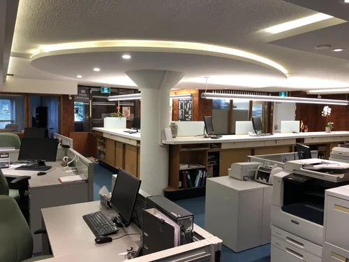 Located on a commercial street in a residential neighborhood in Toronto, this main branch is housed on the ground floor of a three-storey, multi-use building.